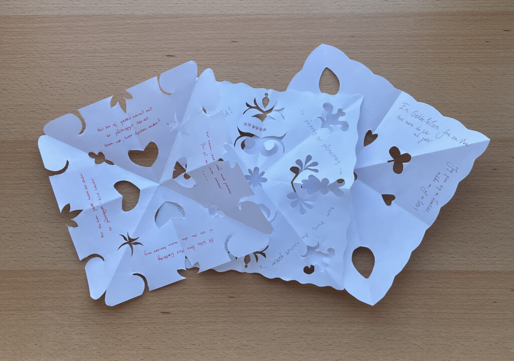 Der er frit slag, hvad angår udklip på papiret. Du folder bare og går i gang. Nogle gange skal man lige bruge et par prøveklip på at acceptere, at den ide, man havde, simpelthen ikke lader sig gøre, men hjerter, blomster og æg går ligesom aldrig af mode i et gækkebrev.