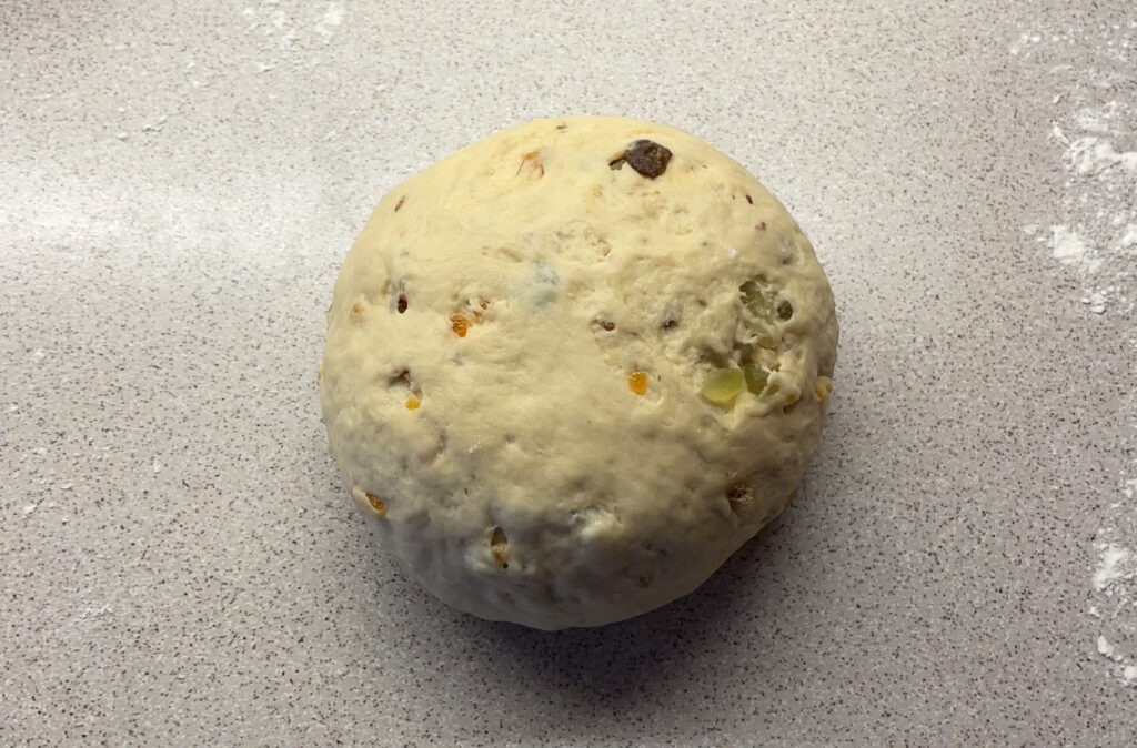 Mælken lunes i en kasserolle, og smørret smeltes ud i. Det må ikke være for varmt, men skal føles rart på en lillefinger dyppet ned i. Gæren røres ud i mælk og smør i en stor skål, og så tilsætter du sukker og salt, der skal opløses. Og det hele kan godt stå og hygge sig lidt, imens du skærer sukat og pomerans ud. Måske har du bare købt det i en bøtte, hvor det allerede er i tern, men der snyder du dig selv gevaldigt!
