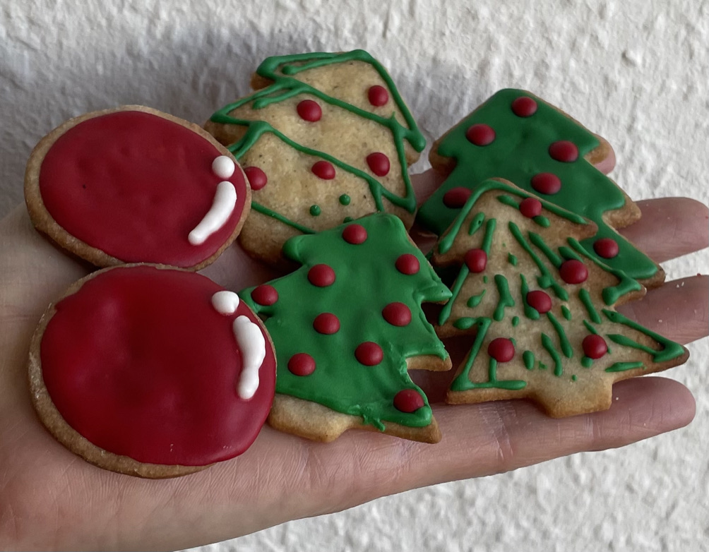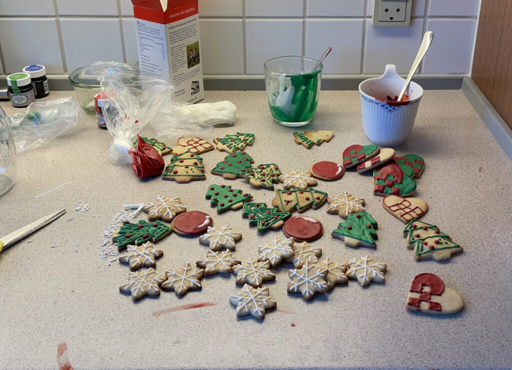 Måske har du lavet snefnug, som blot skal have et drys flormelis fra en sigte, måske har du træer, der skal males med den grønne frugtfarve (og en pensel lavet til fødevarer), måske har du runde kager, der bliver julekugler så snart, du har dyppet dem i rød glasur. Det er dig, der bestemmer. Eller dem, du nu måtte dele køkken og kagedåse med.