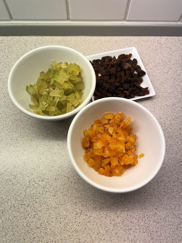 Pomerans, sukat og rosiner hældes nu i skålen, og så slår du æg ud i et glas eller en anden skål og pisker det lidt sammen med en gaffel, før du hælder det op i dejen og rører godt rundt i det hele.