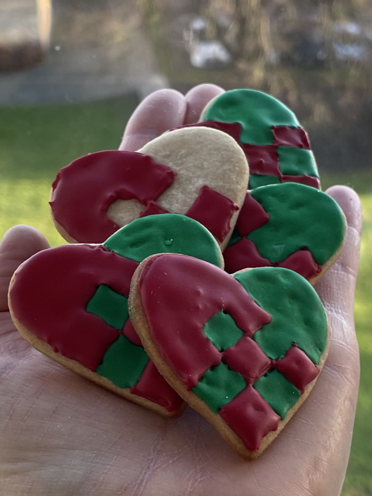 Dine kager køler af på en bagerist, og så er de klar til pynt i alskens farver og kunstfærdighed. Jeg plejer at lave royal icing, som du kender fra butikkernes kransekagepynt. Her blandes glasuren af flormelis og æggehvide (ved stuetemperatur), og den bliver så flot og fast, når den tørrer op. Du kan folde en kornet af bagepapir (der er tutorials på YouTube), eller du kan gøre som mig, hvis du ingen små sprøjteposer har, og bare køre glasuren i en frysepose, slå knude på den (tæt på glasuren), og så – FORSIGTIGT I DEN RETTE TYKKELSE – klippe spidsen af og bruge den som sprøjtepose.