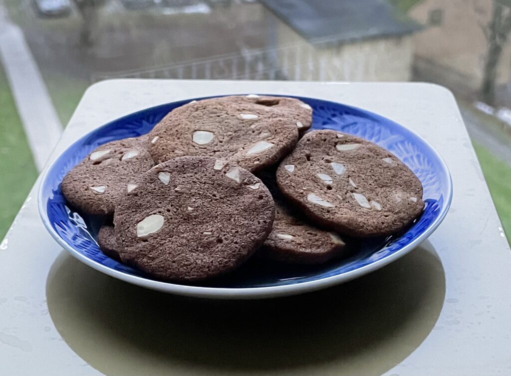 Når rullerne har ligget længe nok (de *kan* bages dagen efter, men jeg sender dig jo i køkkenet på søndag igen), skærer du dem i skiver temmelig tyndt, 3-4 mm, og arrangerer dem fint og sirligt i mønster på en bagepapirklædt plade, som du sætter øverst i en 175 grader varm ovn i 6-7 minutter.