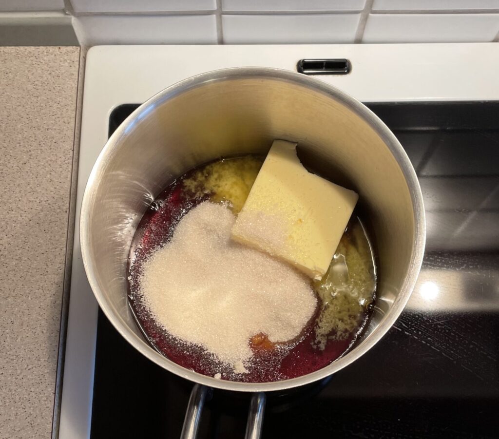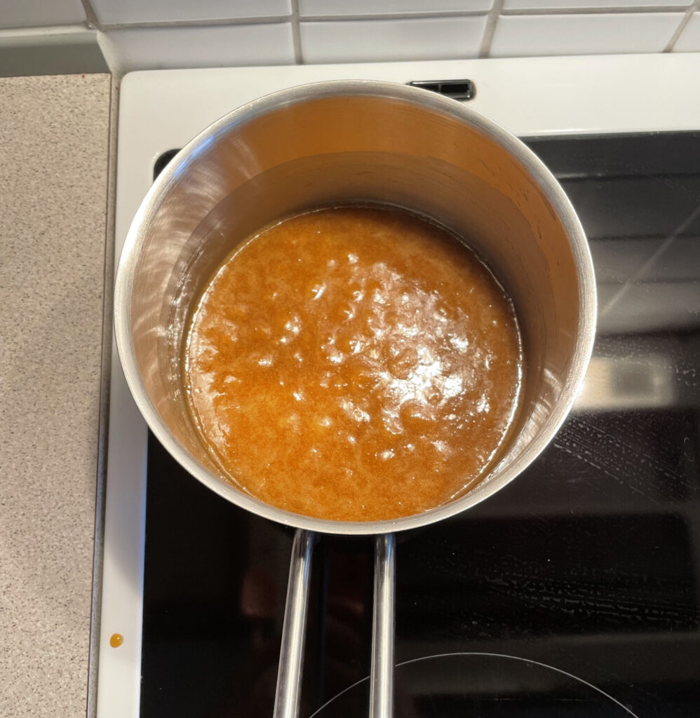 Du lægger, drysser og hælder smør, sukker og sirup i en gryde og tænder for mellem varme, så smørret smelter, og det hele lige koger lidt sammen, alt imens du rører stille i det (kemi på denne her måde er fantastisk; det går fra at være tre ting, som bløpper rundt omkring hinanden til at blive én samlet masse!), og så tager du vidunderblandingen af varmen.