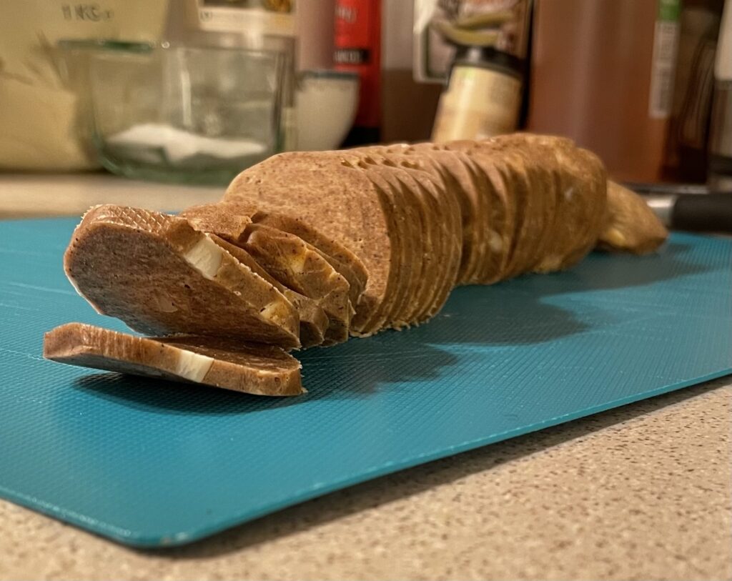 Del dejen i to, og form dem som pølser på hvert sit stykke bagepapir (hvis det ikke lader sig gøre, er det for varmt; så lader du det bare vente lidt i skålen). Rul dem sammen til to nogenlunde ensartet tykke pølser og læg dem på køl. Opskriften siger et par timer, jeg siger mindst natten over og gerne to. Men så står man med bøvlet med at have lyst til at æde rub og stub helt uden bagning.